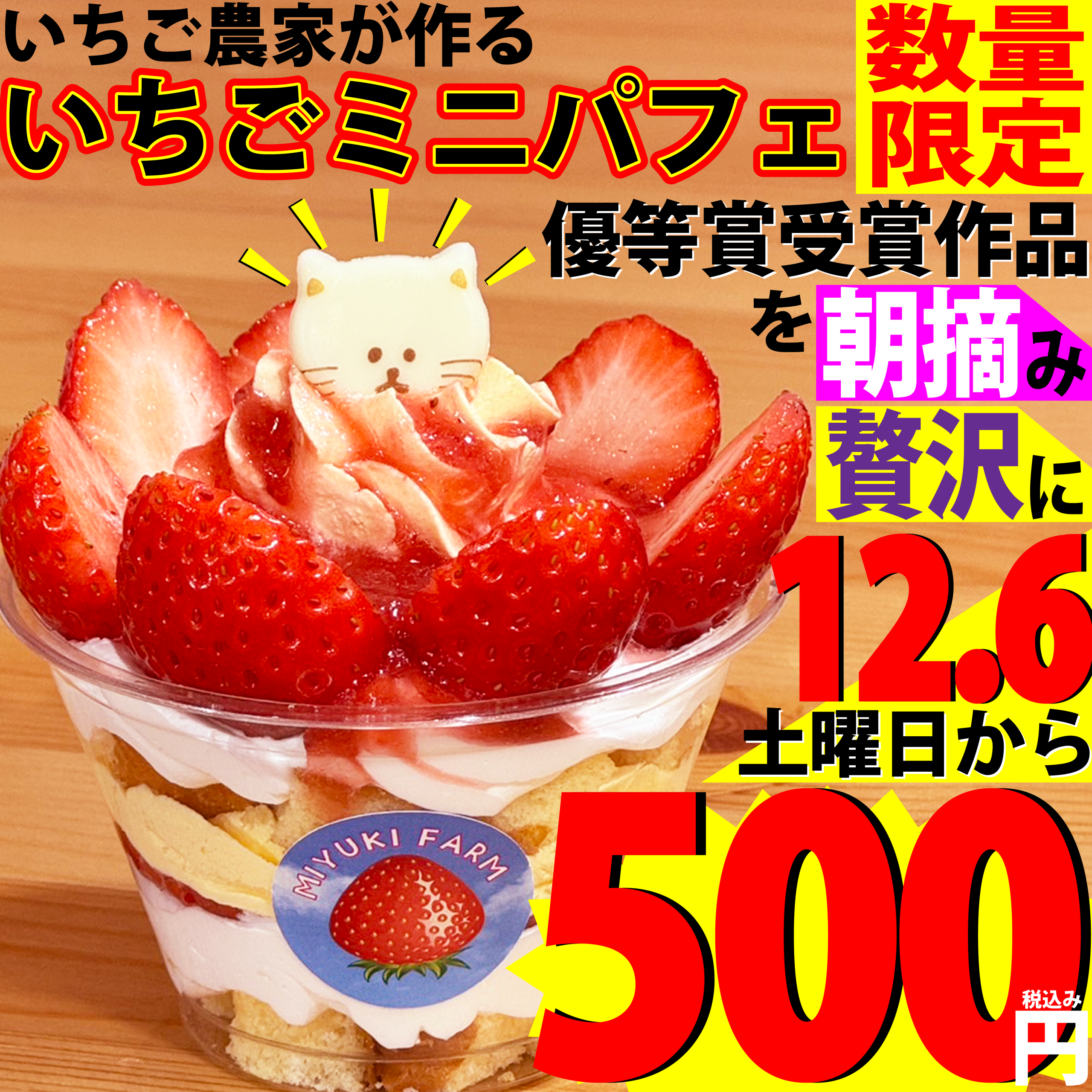いちご販売に先駆けて、ミニパフェが12月6日(土)から新登場! 価格は税込み500円です。